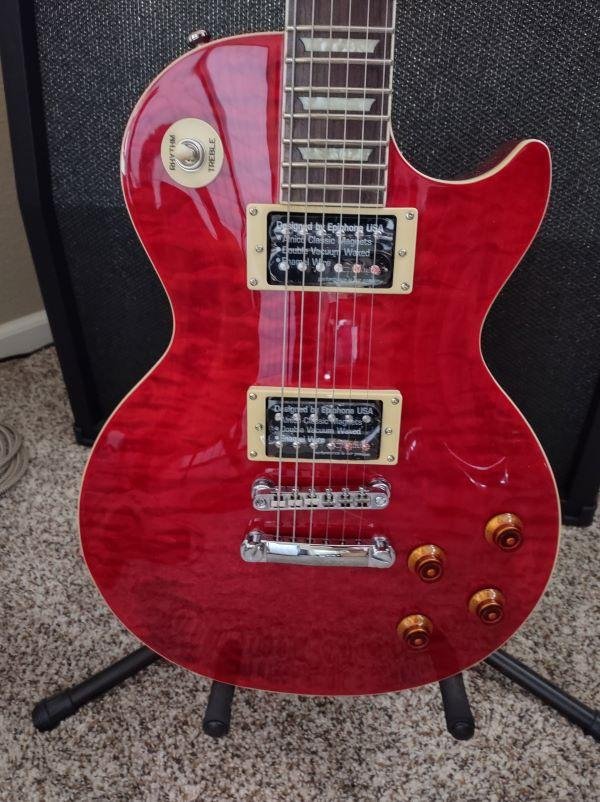 Epiphone has been building quality guitars since 1910 and has based the beautiful Les Paul Classic Quilt Top on one of the most famous guitar designs of all time”the Gibson Les Paul. This guitar, authorized by Gibson, has been painstakingly built 100% to their specs. The mahogany neck, mahogany and alder body, and chrome hardware contribute to the incredibly sweet, signature Les Paul tone. It features a 24-3/4"-scale set neck, 2 open-coil humbucker pickups with a volume and tone control for each, and a 1.68" nut. The fast action, nice sustain, and awesome tone make this highly playable guitar great for any type of music from punk to bluegrass.