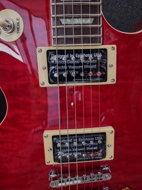 What really makes this guitar stand out however, is the flawless finish and arched, quilted maple carved top. So striking is the quilt top that Epiphone gives you the option of leaving off the pick guard, so as not to hide any of the finish. You will receive a complete pickguard setup if you want the traditional look or are a heavy-handed player whose guitar needs the protection! The rosewood fretboard, with trapezoid inlays and body and neck binding, tops off this charmer. No other guitar sounds like the famous Les Paul.